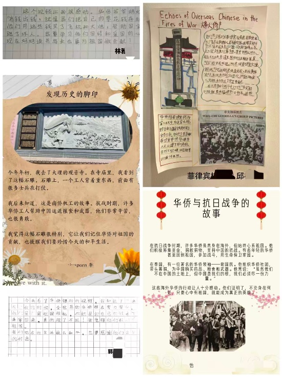 “在抗日戰爭時期,許多華僑雖然身在海外,但始終心系祖國。他們積極籌集資金,捐款捐物,支持中國的抗戰。有些年輕的華僑甚至回到祖國,參加戰斗,用生命保衛家園”,來自泰國絲路國際教育的怡同學表示,“這些海外華僑的行動讓人十分感動。他們證明了,不論身在何處,只要心中有祖國,就能成為真正的英雄。”泰國絲路國際教育的李同學說:“我們要記住華僑對祖國的貢獻,也提醒我們要珍惜今天的和平生活?!币獯罄掠裾Z言學校林同學表示:“我要學習他們團結和愛國的心,現在好好讀書,將來也要為祖國作貢獻!”