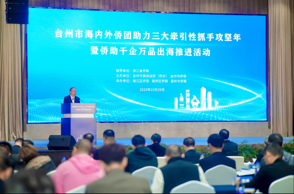 10月29日,臺(tái)州市海內(nèi)外僑團(tuán)助力三大牽引性抓手攻堅(jiān)年暨僑助千企萬(wàn)品出海推進(jìn)活動(dòng)隆重舉行。中國(guó)僑聯(lián)經(jīng)濟(jì)科技部副部長(zhǎng)祁德貴,臺(tái)州市委常委、統(tǒng)戰(zhàn)部部長(zhǎng)苗文斌出席活動(dòng)并致辭。臺(tái)州市有關(guān)部門(mén)代表以及海內(nèi)外僑團(tuán)負(fù)責(zé)人、臺(tái)州市僑商會(huì)代表、臺(tái)州市留聯(lián)會(huì)代表等100余人參加活動(dòng)。